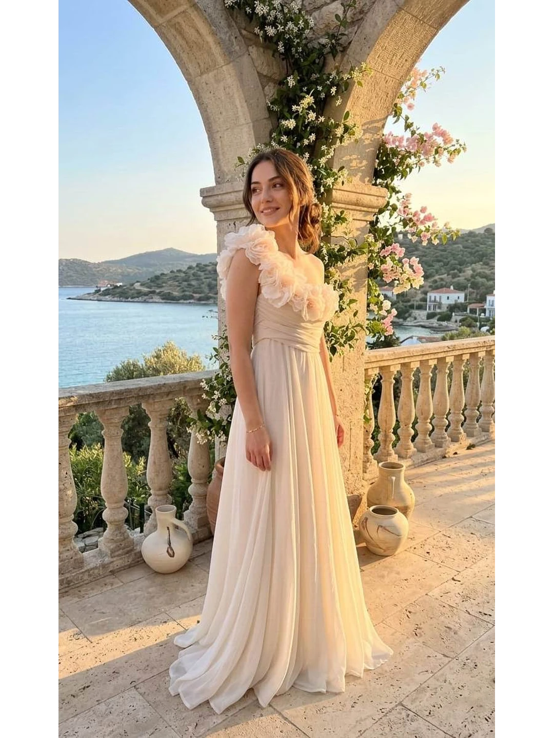 Romantik 3 Boyutlu Çiçek Aplikeleri Elbisenin en çarpıcı ve akılda kalıcı detayı olan tek omuz askısı, özenle hazırlanmış 3 boyutlu şifon çiçek motifleriyle bezenmiştir. Yüzünüze ve omuzlarınıza yumuşak, romantik bir ifade katan bu çiçekler, göğüs kısmındaki usta işi drape (kumaş katlama) detaylarıyla birleşerek son derece zarif ve feminen bir silüet yaratır.