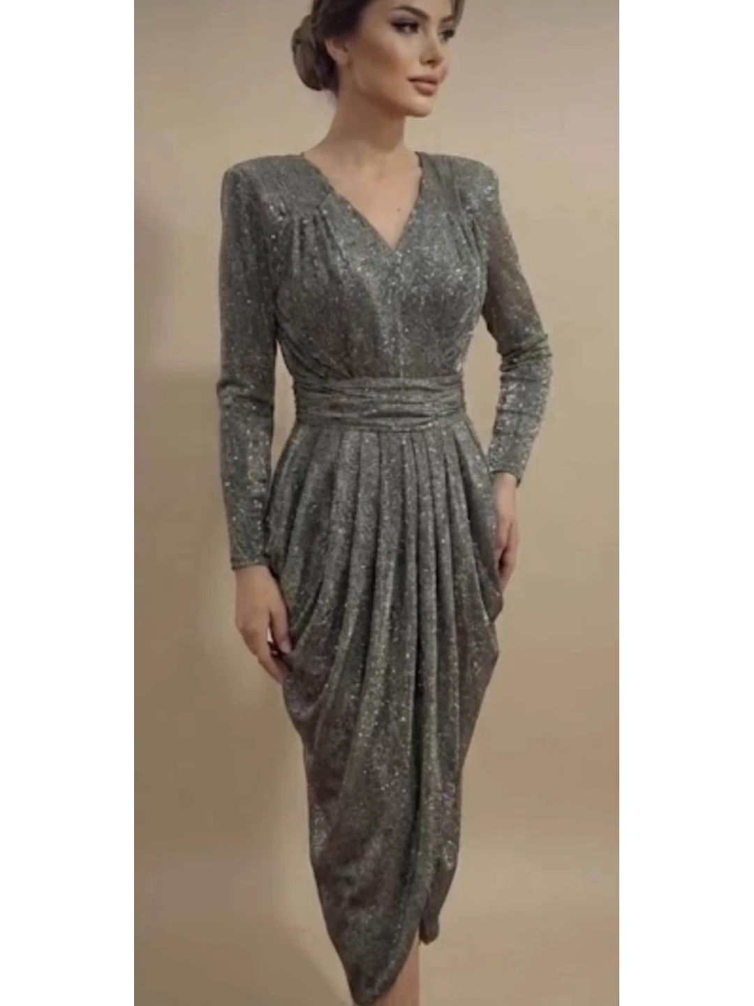Sade ve İddialı: Gümüş ve Gold Yansımalı Parlak Abiye