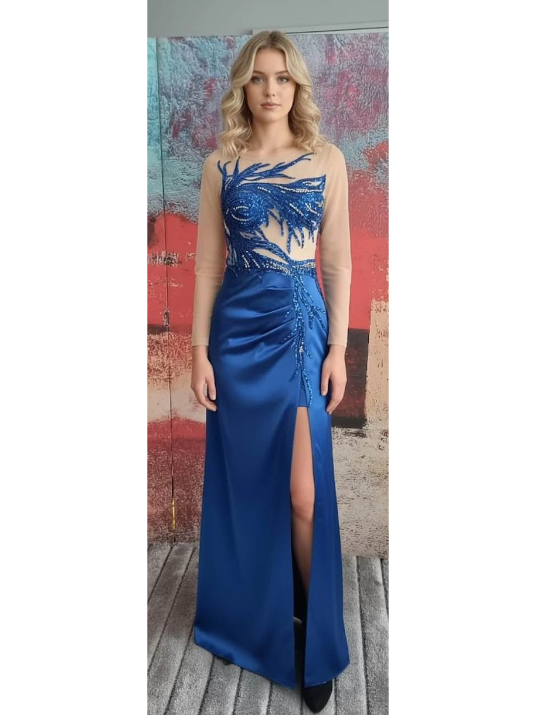 Transparan Dokuda Büyüleyici İşlemeler Elbisenin üst kısmı ve uzun kolları, ten rengi illüzyon tül üzerine özenle işlenmiş saks mavisi parlak aplikelerle donatılmıştır. Transparan görünümün üzerine adeta bir sanat eseri gibi yayılan bu ışıltılı dalga motifleri, dekolte bölgenize ve kollarınıza gizemli ve sofistike bir şıklık katar.