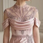 İllüzyon Yaka ve Muazzam El İşçiliği Elbisenin üst bedeni, ten rengiyle bütünleşen yarı şeffaf (illüzyon) tül üzerine baştan sona tamamen el işçiliğiyle işlenmiş parlak yaprak ve çiçek motifleriyle donatılmıştır. Dik yaka formundan başlayıp göğse, sırta ve uzun kolların manşetlerine kadar uzanan bu ışıltılı işlemeler, lüks ve sofistike bir görünüm sunar. Omuzlardan zarifçe düşen saten drape detayları ise tasarıma romantik bir hava katar.