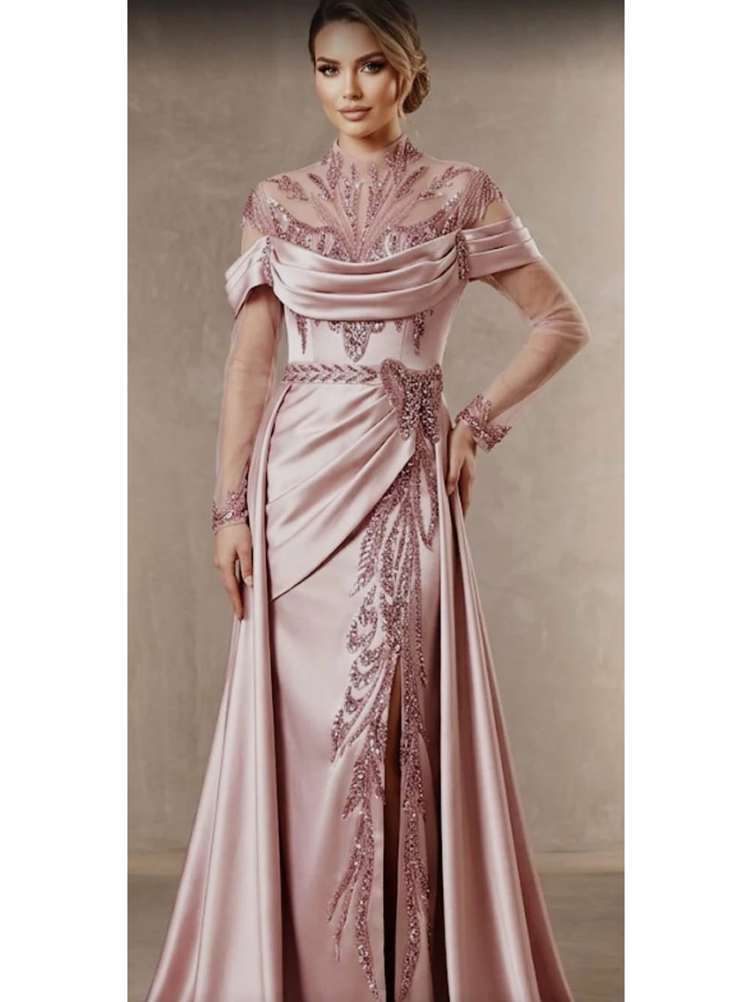 Asil ve Büyüleyici: Tamamen El İşlemeli Kuyruklu Pudra Saten Abiye