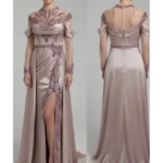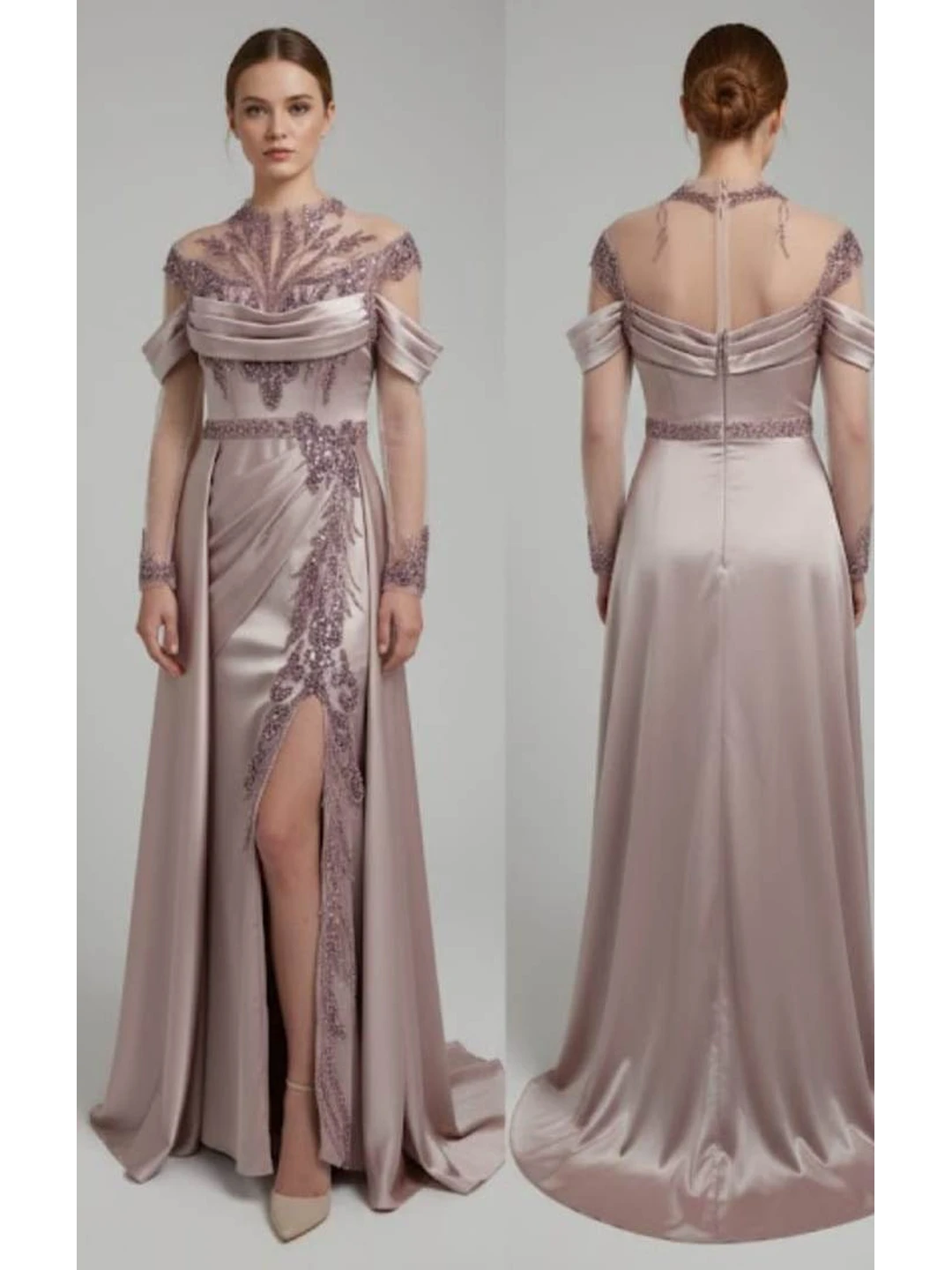 • Tasarım: Dik/İllüzyon yakalı, uzun kollu, düşük omuz drapeli, yırtmaçlı ve kuyruklu gece elbisesi
