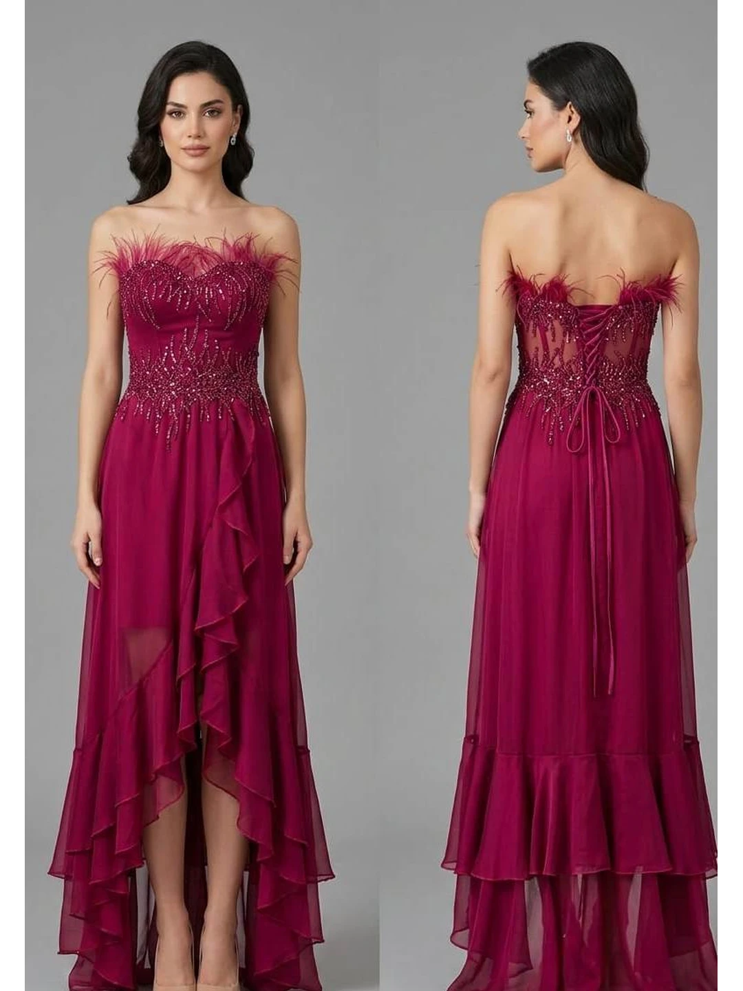 Bordo rengin büyüleyici enerjisi! Göğüs kısmındaki tüy detayları, ışıltılı taş işlemeli transparan korsajı ve önü kısa arkası uzun uçuşan volanlı şifon eteğiyle kusursuz bir ritim yakalayın. Arkadan bağcıklı yapısı sayesinde bedeninize tam oturan, mezuniyet ve nişan davetleri için iddialı bir abiye.